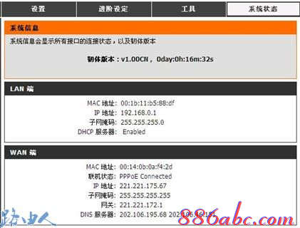七、系統狀態界面中看到PPPoE已經連接上,且友訊DI-524M無線路由器的WAN端也獲取到了由電信部門分配的IP地址信息。