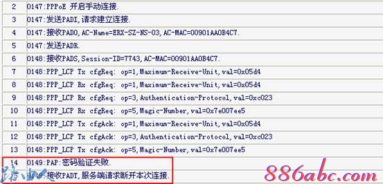 當(dāng)你設(shè)置了PPPOE撥號后,無法獲取WAN口IP時,可進入管理界面―系統(tǒng)工具―系統(tǒng)日志,如果你看到的日志是: