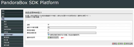 5、點擊左側的”虛擬WAN接口“,“啟用”前面打對鉤,“虛擬接口”數量建議輸入“10”,“斷線自動重連”打對鉤,最低在線數輸入“1”,“保存并應用”。