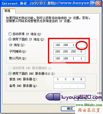 IP地址輸入192.168.1.X(X可以是2-254的任何一個數字,最好是2-8),然后在子網掩碼上點一下,如果是WIN2000或WINXP就會自動填上(255.255.255.0)再在默認網關上填上:192.168.1.1,現在再確認就OK了!