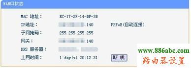 重啟完成后進入TL-H18R管理界面(http://192.168.1.1),點擊運行狀態,正常情況下會看到WAN口狀態的IP地址后有了具體的參數而不是0.0.0.0,說明此時路由器已經連通互聯網了。