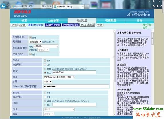 | 11.無線配置→基本(11n/g/b):啟用無線電通信,允許廣播SSID ,300M無線路由選擇帶寬“40MHz”。使用SSID1,選擇“驗證”、“加密”方式及填寫預共享密鑰(設置密碼)。如無特殊需求,建議取消使用其他SSID,如:SSID2,SSID3等。點擊“應用”后路由自動重啟。 |