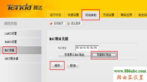 3、 如果不接我們的路由貓上網(wǎng)正常,您再進(jìn)入路由貓的管理界面,點擊右上角的“高級設(shè)置”,再點網(wǎng)絡(luò)參數(shù)里面的“MAC克隆”,再點擊“克隆MAC地址”,再點擊“保存”。再點擊“馬上重啟”,將路由貓進(jìn)行重啟。