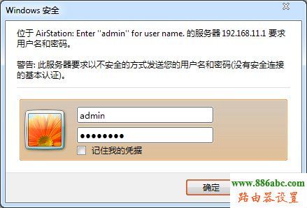 1.進入路由器web管理設置界面:打開瀏覽器,在地址欄里輸入本產品的IP地址(出廠默認為192.168.11.1),然后按回車鍵。出現要求輸入用戶名密碼的畫面時,請按以下輸入:用戶名→admin 密碼→password,點擊[確定]。