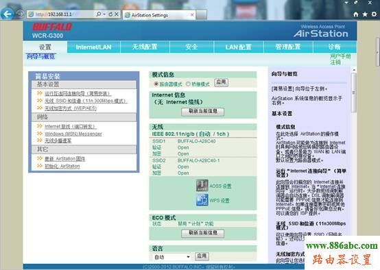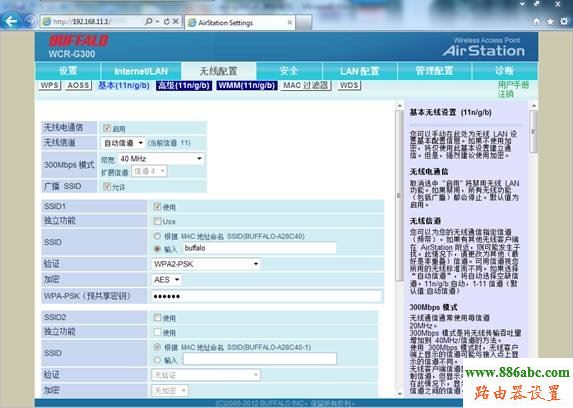 7. 無線配置→基本(11n/g/b):啟用無線電通信,允許廣播SSID ,300M無線路由建議選擇帶寬“40MHz”。使用SSID1,SSID可使用默認設置(配置Airstation 的MAC地址***),也可在“輸入”欄中自行輸入所需設定的無線網絡名稱。選擇“驗證”、“加密”方式及填寫預共享密鑰(設置密碼)。如無特殊需求,建議取消使用其他SSID,如:SSID2等。點擊“應用”后路由自動重啟。