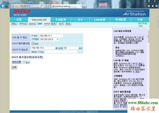 5.啟用DHCP服務器功能。操作步驟:點擊“Internet/LAN”→“LAN”路由器默認DHCP IP地址池為192.168.11.2~64,也可手動更改IP地址范圍以及排除指定IP地址。