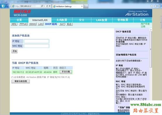 6.可手動添加及分配DHCP,添加或手動分配DHCP后,刷新當前信息。 操作步驟:點擊“Internet/LAN”→“DHCP租用”,輸入需添加的客戶機IP地址/MAC地址,點擊“添加”。