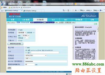 | 11.無線配置→基本(11n/g/b):啟用無線電通信;允許廣播SSID ;SSID可使用默認設置(配置Airstation 的MAC地址***),也可在“輸入”欄中自行輸入所需設定的無線網絡名稱;選擇“無線驗證”、“無線加密”方式及填寫預共享密鑰(設置密碼)。點擊“應用”。 |