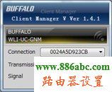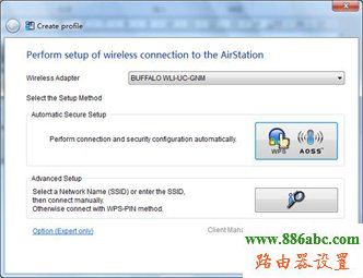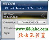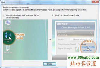 | 1.將路由器開關撥在OFF狀態。 接通電源后,可通過無線網卡(截圖為buffalo無線網卡的無線連接工具ClientManagerV,用戶也可使用windows自帶的無線連接工具連接。)尋找該路由的無線SSID信號,進行連接。使用ClientManagerV連接無線網絡的具體步驟如下: a.啟用該軟件,出現如下界面,點----------擊“Create Profile” |