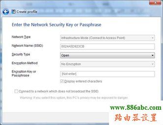 | f.選擇網絡加密方式(默認安全類型為open,無驗證),點擊“Connect” |