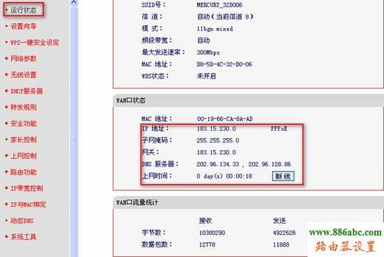 3. 撥號的連接或斷開操作可通過點擊管理界面左側邊欄框中“運行狀態”欄,點擊右框“WAN口狀態”中的連接/斷開按鈕來實現。