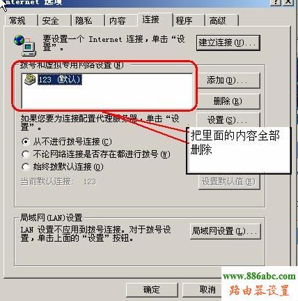 注意:由于使用路由器進行拔號,以前的電信拔號軟件就不需要了。打開IE瀏覽器,找到“工具”菜單下的“Internet選項”,再點擊“連接”。如圖: