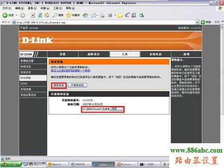 首先打開瀏覽器,在地址欄鍵入192.168.0.1,登錄到路由器WEB管理界面(默認狀態下用戶名為admin,密碼為空),進入配置界面后,點擊上面“工具”菜單,然后點擊左側的韌體更新按鈕。在該界面下,可以看到目前所使用的韌體信息。