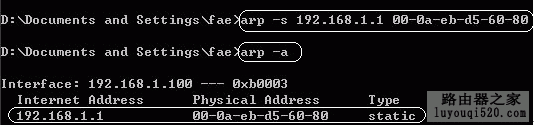 通過(guò)“arp –s 路由器IP+路由器MAC”這一條命令來(lái)實(shí)現(xiàn)對(duì)路由器的ARP條目的靜態(tài)綁定,如輸入:arp –s 192.168.1.1 00-0a-eb-d5-60-80,然后通過(guò)arp -a 命令輸出,可以看到已經(jīng)有了我們剛才添加的條目,Type類(lèi)型為static表示是靜態(tài)添加的。至此,我們也已經(jīng)設(shè)置了電腦的靜態(tài)ARP條目,這樣電腦發(fā)送到路由器的數(shù)據(jù)包就不會(huì)發(fā)送到錯(cuò)誤的地方去了。