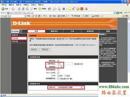 點擊左側無線設置。默認情況下DI-524M無線功能是激活狀態(即您開啟路由器后,您的計算機即可通過無線網卡找到該設備);默認的無線網絡名(SSID)為dlink(您能夠搜索到該設備的名稱);默認信道為6;默認無任何安全方式。