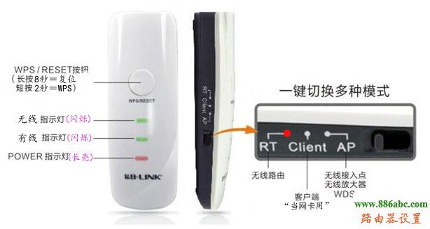 接入電源到MP01后,路由器上WIFI指示燈是否有閃爍(大約1秒閃爍一次)。當(dāng)網(wǎng)線接入網(wǎng)口后,路由器上WLAN指示是否有亮或閃爍,若不亮,則表示為線路不通,請重新接入網(wǎng)線或更換網(wǎng)線或重作水晶頭。指示燈狀態(tài)及模式選擇說明如下圖: