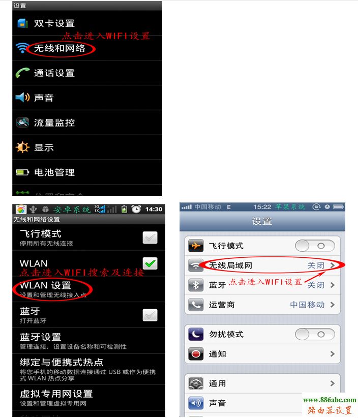 ①、從手機菜單項的“設(shè)置”項,開啟手機中的無線WIFI設(shè)置項,進入無線搜索列表中。如下圖: