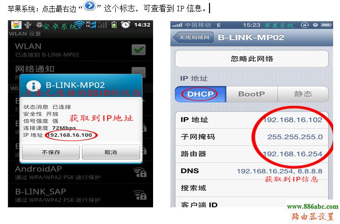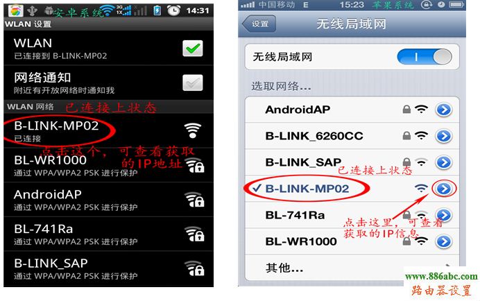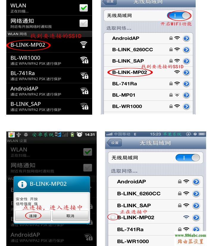 ②、找到要連接的SSID(比如本例當(dāng)中的B-LINK-MP02),并連接它。如下圖: