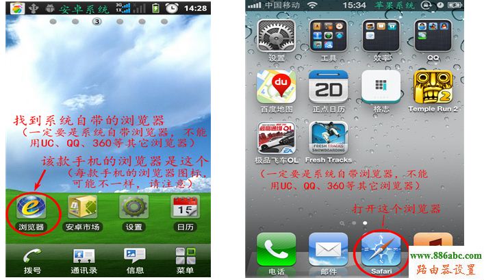 ①、找到手機系統(tǒng)自帶的瀏覽器,(這里一定要找到系統(tǒng)自帶的瀏覽,像UC、QQ、360、百度等瀏覽器,很多是登錄不進WEB管理頁面里),如下圖所示: