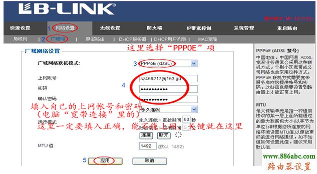 找到“網(wǎng)絡(luò)設(shè)置”-“廣域網(wǎng)”,在廣域網(wǎng)模式中選擇“ADSL虛擬撥號(PPPOE)”這項,在下面填入自己寬帶上網(wǎng)帳號和密碼(也就是原電腦上網(wǎng)時“寬帶連接”里的用戶名和密碼),此處一定要填入正確,否則,路由器不可能撥上號。如下圖: