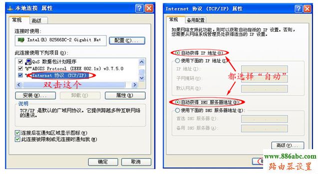 ③、雙擊“TCP/IP協議”,兩項都選擇“自動獲得”,如下圖: