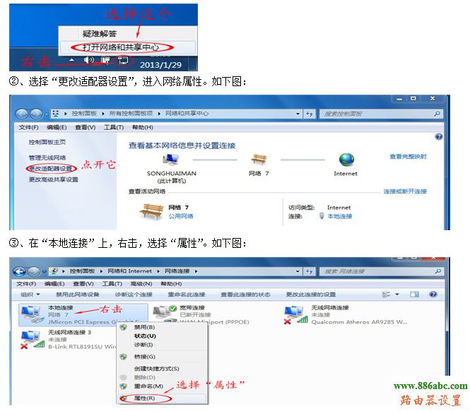 ①、在桌面上右下角網絡標志上右擊,選擇“打開網絡和共享中心”,如下圖: