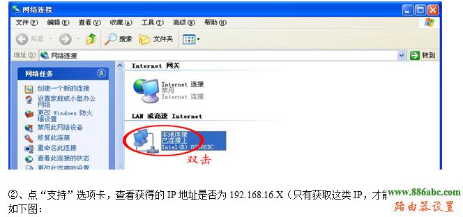 ②、點“支持”選項卡,查看獲得的IP地址是否為192.168.16.X(只有獲取這類IP,才能做第五步)。如下圖: