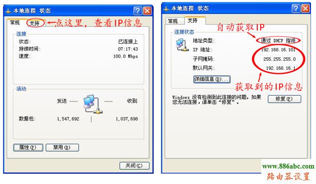 三、查看本地連接獲取的IP地址。(包含XP系統、WIN7系統下,詳細如下)