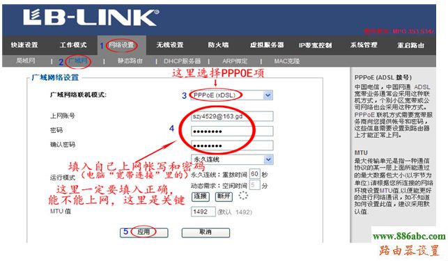 找到“網絡設置”-“廣域網”,在廣域網模式中選擇“ADSL虛擬撥號(PPPOE)”這項,在下面填入自己寬帶上網帳號和密碼(也就是原電腦上網時“寬帶連接”里的用戶名和密碼),此處一定要填入正確,否則,路由器不可能撥上號。如下圖: