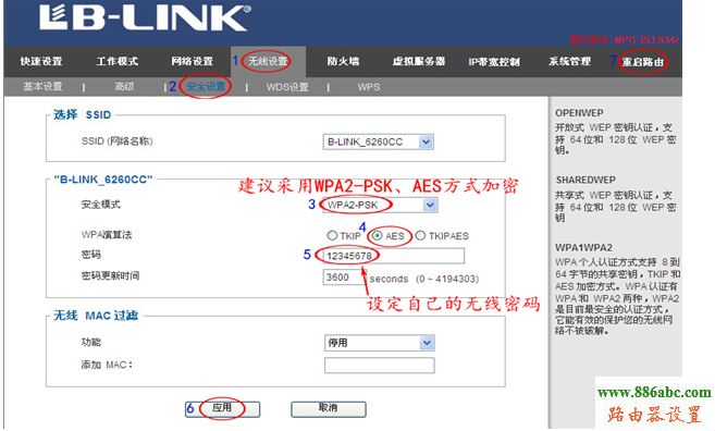找到“無線設置”-“安全設置”,安全模式選“WPA2-PSK”,WPA算法選“AES”,密碼在8-15位之間(密碼太長,在無線連接時容易出錯),設置好后,先點“應用”,再點“重啟路由”讓路由器生效。如下圖: