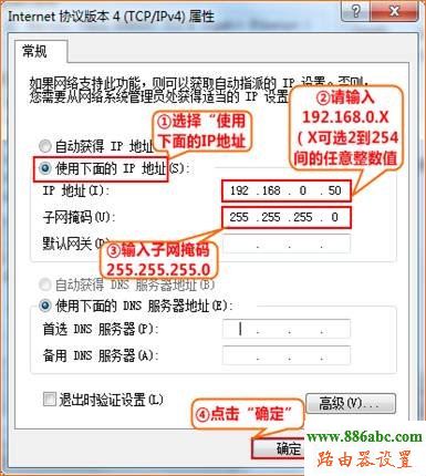 第二步:設置電腦的本地連接IP地址為“192.168.0.X”(X為2~254之間的任意整數(shù)),子網(wǎng)掩碼為“255.255.255.0”;